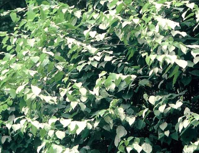 そんなある日、昨日は緑色だった葉が、次の日に白色になっていました。またその次の日には、白色の葉が増えていました。マタタビ(マタタビ科マタタビ属)でした。マタタビの葉が白色に変化する瞬間に立ち会えたように感じ、とても感激しました。マタタビは6月に花期を迎えますが、その頃に、枝先の葉の何枚かが、葉の半分または全体が白色に変化していきます。つる性木本のため、立木に覆いかぶさっているので、木全体に白い花が咲いているように見えます。