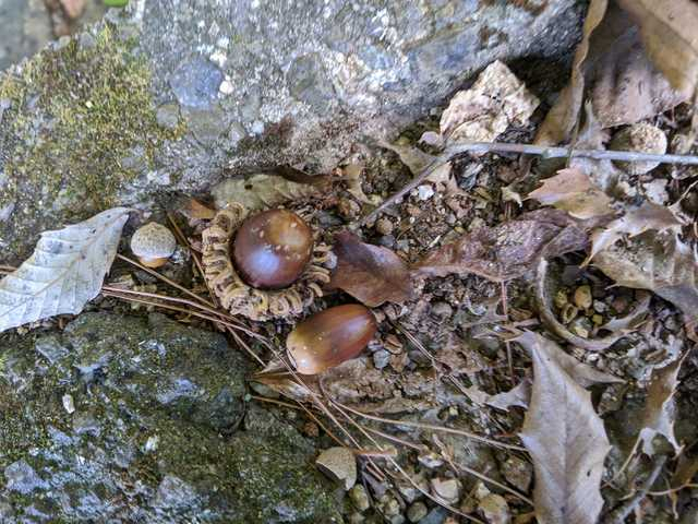 その1、団地の横の細い坂道、道の脇の溝にはイガイガの帽子(殻斗(かくと))や大きな丸いドングリがたまっています。このドングリは9月の終わりごろに熟すクヌギ又はアベマキのドングリです。